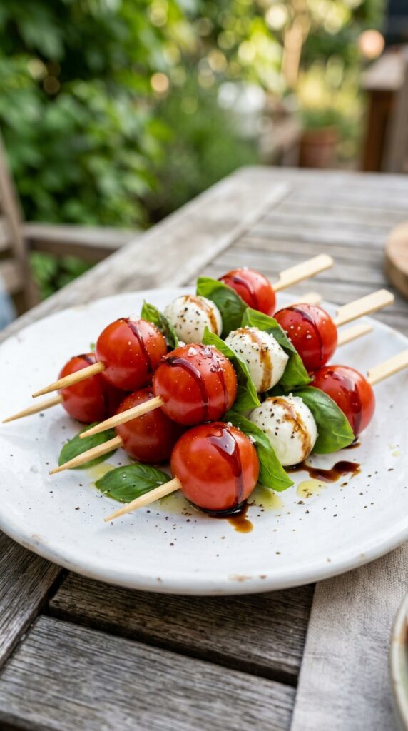 These no-cook Caprese skewers are a fresh and elegant appetizer that’s perfect for hot days. Juicy tomatoes, creamy mozzarella, and fragrant basil come together in a simple yet flavorful bite. Drizzled with balsamic glaze, they’re quick to assemble and always a hit at potlucks.