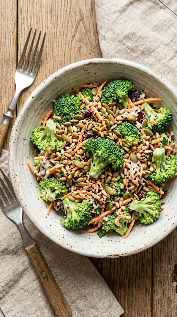 3. In a large bowl, combine broccoli, carrots, onion, and sunflower seeds.