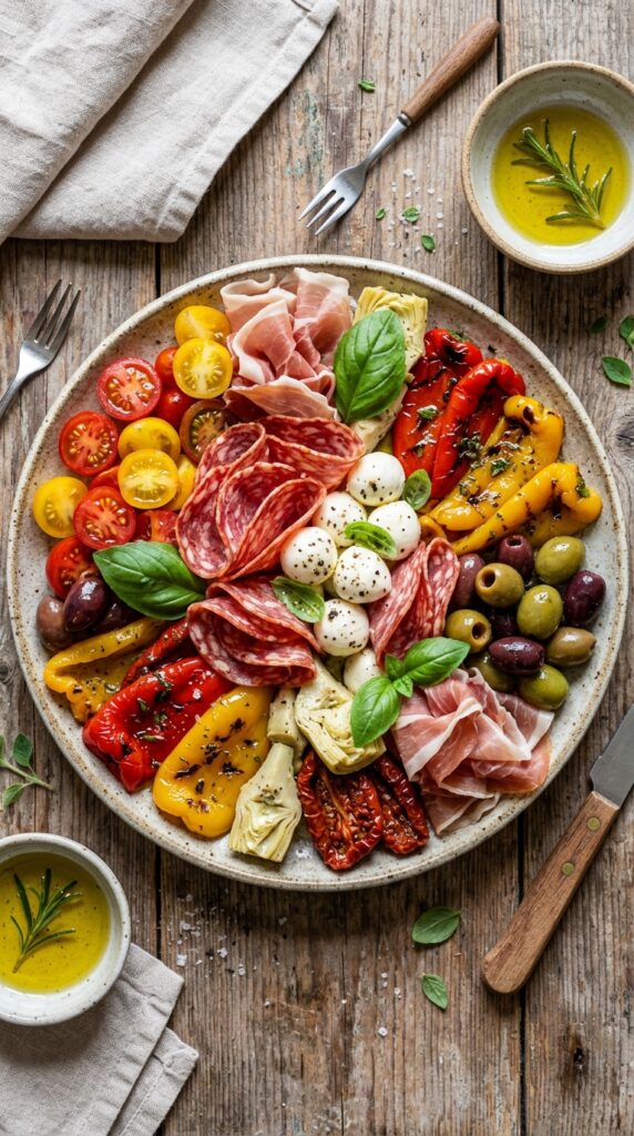 An antipasto salad platter is a vibrant, no-cook dish loaded with bold Mediterranean flavors. A mix of cured meats, cheeses, and fresh vegetables creates a colorful and satisfying spread. Perfect for sharing, it’s easy to assemble and makes a visually appealing centerpiece for any summer potluck or gathering.