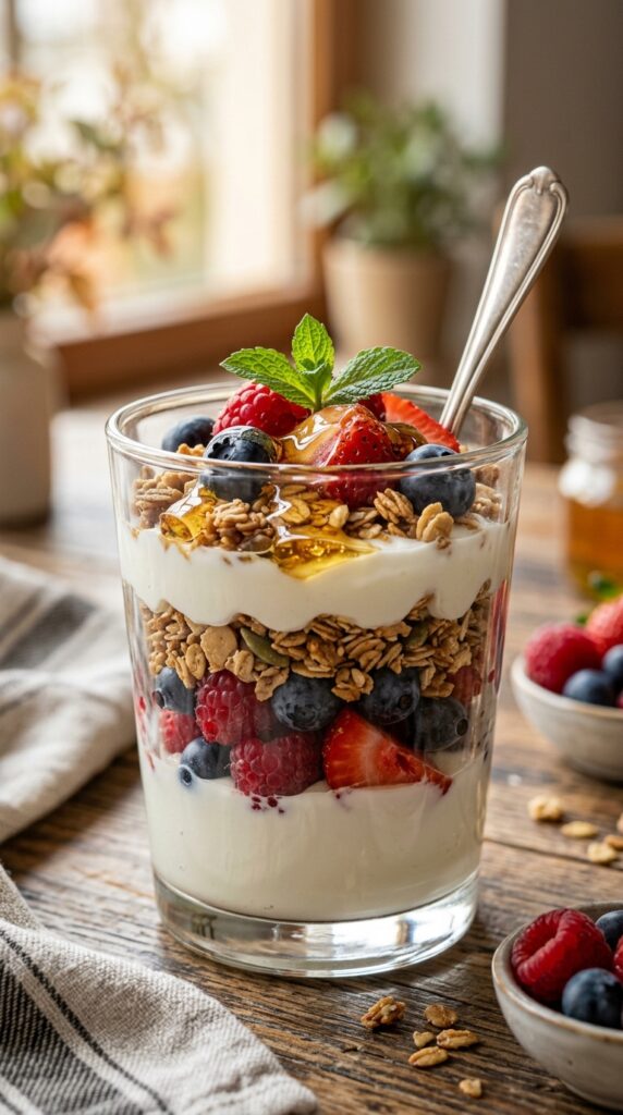 These Greek yogurt fruit parfait cups are light, refreshing, and perfect for warm days. Layers of creamy yogurt, fresh fruits, and crunchy granola create a balanced mix of textures and flavors. They’re quick to assemble, naturally sweet, and ideal for potlucks where you want something healthy, colorful, and satisfying without any cooking.