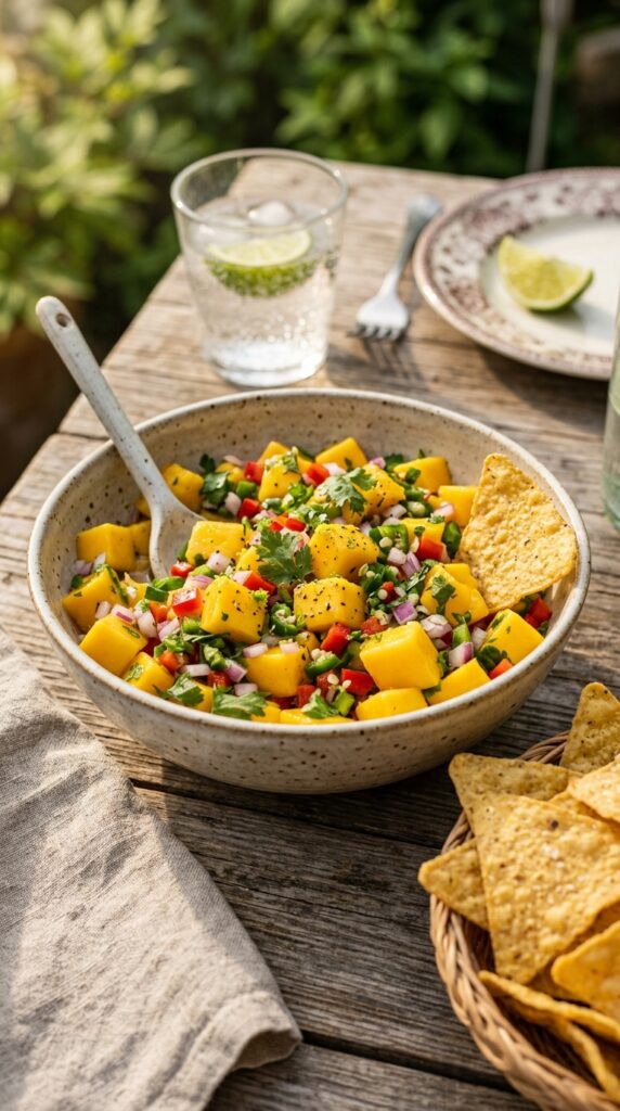 Mango salsa with tortilla chips is a bright and refreshing no-cook dish packed with sweet and tangy flavors. Juicy mango pairs perfectly with fresh vegetables and a hint of citrus, creating a vibrant dip. It’s quick to prepare, colorful, and perfect for summer potlucks or casual gatherings.