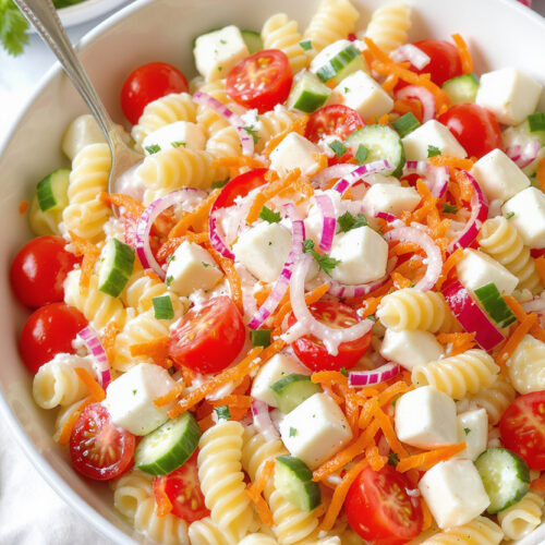 - In a large bowl, combine pasta, tomatoes, cucumber, bell pepper, carrots, and red onion.